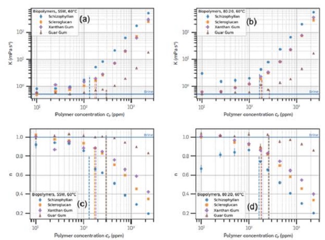 Through fits of the Power Law model, Equation 1, it was possible to compare the results better. Figure 8 contains the fit parameters K and n for the biopolymers at 60°C, in SSW and brine mixture 80:20. The error bars are one standard error of fit. Some error bars are smaller than the markers. The vertical Lines indicate the respective mean c* values obtained previously.