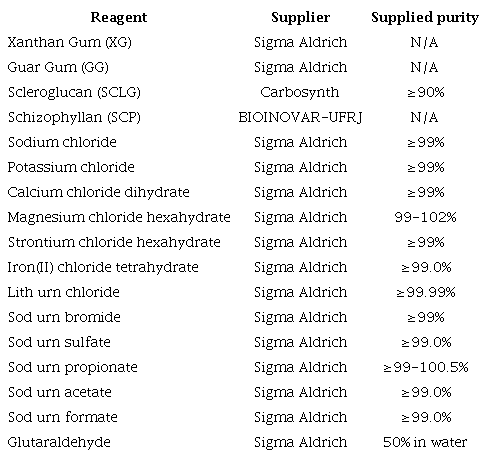 Table 1 lists the reagents used in this study, their supplier, and purity. The suppliers of Xanthan Gum, Guar Gum, and Scleroglucan did not provide any information about the purity or purification methods. More information on the production of Schizophyllan used in this work can be found in reference [72].