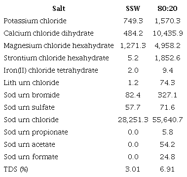 Table 2 lists the brine composition for the Synthetic Sea Water (SSW) and the mixture of 80% SSW and 20% Synthetic Formation Water (SFW), hereafter called merely 80:20. The brine 80:20 was used to simulate the mix between seawater and reservoir formation water during the injection process. The quantity of each salt was corrected by the water content of each hydrated salt.