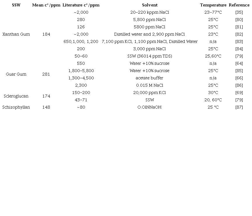 Regarding the applicability for EOR, the smaller the overlap concentration, the Lower is the minimum required quantity of polymer to achieve the viscosity target for EOR applications. Therefore, using Xanthan Gum as our basis, it can be seen that Schizophyllan would require Lower concentrations than Xanthan Gum to reach a target viscosity. Despite having the same structure as Schizophyllan Scleroglucan has a different rheological behavior, very close to Xanthan Gum. The similarity of Scleroglucan to Xanthan Gum has already been observed [16], [20], [43], On the other hand, Guar Gum has a much Lower viscosifying effect and higher c* values, making it, at first glance, a poor substitute for Xanthan Gum.