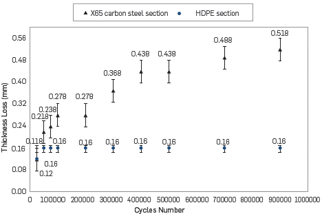 On the other hand, the resistance of HDPE section to combined damage mechanisms of abrasion and C02 corrosion is evident, with a very slight thickness loss at the beginning test, which continued constant until complete total number of cycles. The slight abrasive wear would be caused, among other factors, by effect of shear stress of biphasic fluid (brine + sand production) and internal pressure in pipeline section.
