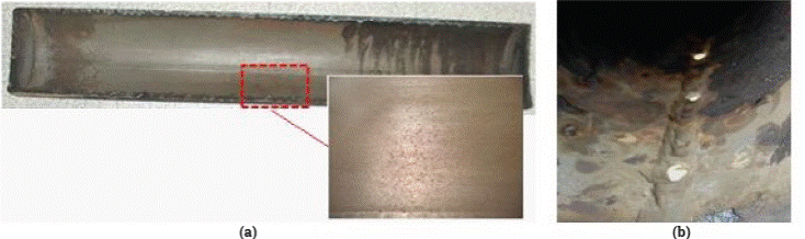 Thickness loss under the evaluated conditions demonstrates the abrasive and corrosive effect of the test fluid on the internal surface of the carbon steel section. As it is also observed in Figure 3, the thickness loss is 0.44 mm in a 10-day period, assuming a linear behavior. It is possible to estimate in the carbon steel a total thickness loss at 6-o'clock position over a 6-month period This result is in agreement with the performance evidenced in the collector lines of Casabe's field, where in a period ranging between 6 and 9 months, the carbon steel pipeline presents failure and fluid leakage at 6- o'clock position, Figure 4b, as a result of the combination of abrasive wear and corrosion. It is a fact that these failure mechanism significantly reduces the lifetime due to the higher rate of material loss [20]