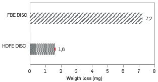 In Figure 5, abrasion resistance obtained on flat discs of HDPE and FBE organic coating is shown in terms of weight loss (mg) before and after applying a load of 1000 g during 1000 cycles of exposure.