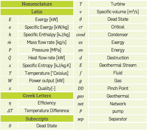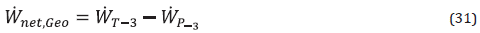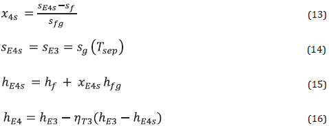 According to the Equation, a single flash geothermal power plant provides the most turbine power when the separator runs at average producer well and condenser temperatures. It will be assumed that the system is near a steady-state to make simulation easier. It has also been proved that isentropic efficiency may be reached in pump and turbine operation. Table 2 shows the mathematical model of the planned circulation system.