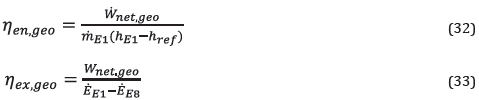 RESUMEN: La reutilización del calor disipado en los ciclos termodinámicos es una propuesta interesante para aumentar la eficiencia. En este trabajo se propone un ORC (Organic Rankine Cycle) de dos etapas para recuperar y reutilizar la energía desperdiciada de un SFGC (Single Flash Geothermal Cycle). Los fluidos de trabajo estudiados para el sistema de recuperación incluyen R227ea y R116 y R124 y R125. El efecto de los principales elementos del rendimiento del sistema se investiga mediante un análisis de sensibilidad y también se calcula la degradación de la exergía de varios componentes. Los resultados indican que los fluidos de trabajo R227ea y R116 tienen una la eficiencia térmica mejorada en un 7,66%, pasando de 0,2023 a 0,2178; mientras que para R124 y R125 la eficiencia térmica del sistema mejora en un 7,61%, pasando de 0,2023 a 0,2177. La eficiencia exergética del fluido de trabajo inicial mejora en un 15,04%, de 0,5044 a 0,5803. Además, el segundo par de fluidos de trabajo pasa de 0,5044 a 0,5852, lo que indica una mejora de la eficiencia del sistema del 16,01%. El 85% de la exergía del sistema se elimina a través de la válvula de expansión, la turbina 3, el intercambiador de calor 2 y el mezclador. Además, si se incluye la fase de recuperación en la base, el SFGC afectará positivamente al rendimiento de la central eléctrica.