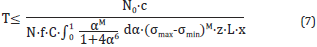 Where f is the impact coefficient of the drill, C is the number of stress cycles of the derrick when the drill string is raised by 1 m, φ is the probability density function of the drilling load, N0 is the stress cycle base, S is the total number of meters of the rig lifting the drill string during the life of the derrick weld, α is relative drill string weight, for derrick fatigue calculation, αmax =1.