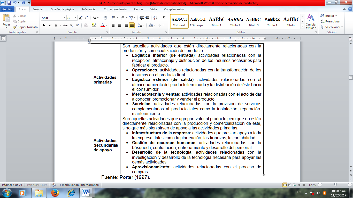 Según Porter (1997) y Chacón (2009), la cadena de valor es un modelo teórico que grafica y describe las actividades generadoras de valor que van desde las materias primas básicas, pasando por los proveedores de componentes, hasta el último producto para el uso entregado en las manos del consumidor final, creando una ventaja competitiva frente a organizaciones cuando es capaz de aumentar el margen de valor (ya sea minimizando sus costos o incrementando el volumen de las ventas). Las actividades generadoras de valor se clasifican en primarias y secundarias, tal como se presenta en la Cuadro N° 1.