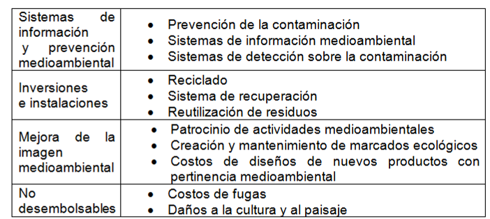 Esta concepción se amplía con los avances de Spallarossa (2000) quien indica que: “los costos medioambientales consisten en la valoración de la aplicación racional de los factores ambientales necesarios para la obtención de un producto, realización de un proceso o prestación de un servicio” (p. 62), así como la asimilación por el entorno natural de los desechos de las actividades de producción y consumo del ser humano. No obstante, el problema radica en cómo medir y reconocer estos costos ambientales, para ello se deben tener en cuenta tres aspectos, de acuerdo con Pulido (2009): a.- La posibilidad de establecer criterios de medición; b.- que se hayan realizado sacrificios económicos para la conservación de los recursos naturales; y c.- la obtención de ingresos financieros a futuro por el sacrificio económico realizado.