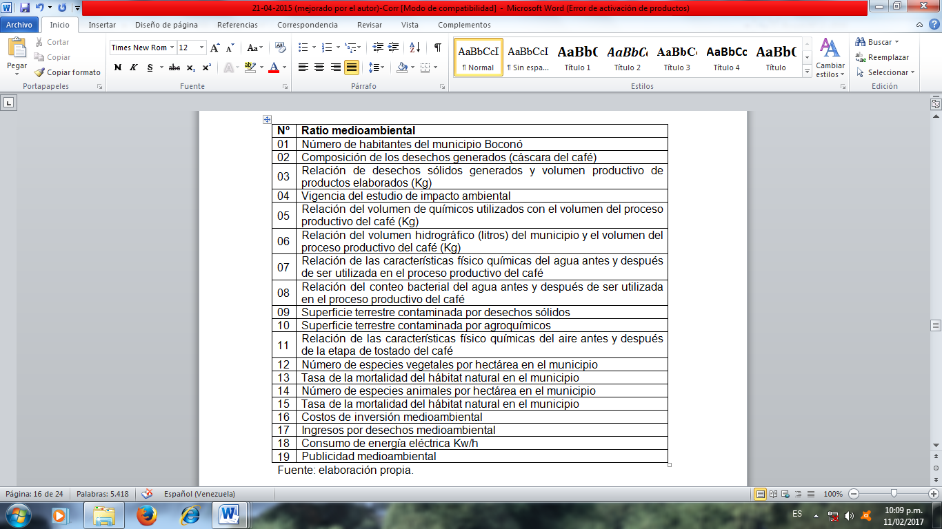 Con relación al resultado de los ratios medioambientales, la gerencia de la “Torrefactora y Envasadora Boconó, C. A.” considera que no utiliza indicadores ambientales porque no ocasiona daños ambientales, sin embargo, de acuerdo con Ludevic (2009), éstos deben aplicarse para precisar el cumplimiento de objetivos y metas desde el punto de vista de la gestión ambiental por lo cual genera una clara desventaja para la empresa; por lo tanto, a continuación se expone la aproximación a la construcción de presumibles ratios medioambientales en concordancia con Ludevic (2009) y a las leyes venezolanas ambientalistas, específicamente con lo citado en el Art. 127 de la Constitución de la República Bolivariana de Venezuela (1999), el Art. 3 de la Ley Orgánica del Ambiente (2006), y en el Art. 1 de la Ley de Gestión de la Diversidad Biológica (2008), expresando respectivamente la obligación de los ciudadanos y del Estado de resguardar al medioambiente, la necesidad de emitir acciones para la protección del ambiente, y la necesidad de resguardar principios de la conservación ambiental, lo cual puede cumplirse legalmente mediante la elaboración de estos ratios medioambientales (ver Cuadro N° 4):