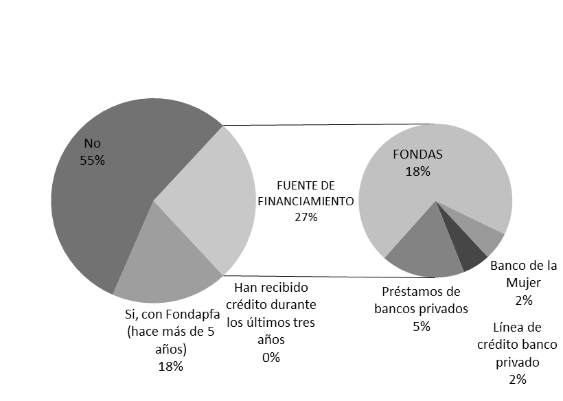 Por otro lado, el 5% recibió créditos a través del Fondo de Desarrollo, Agropecuario, Pesquero, Forestal y Afines (FONDAPFA), hace más de cinco años, fondo que fue liquidado en el año 2008; es de hacer notar que según las entrevistas, los productores manifestaron que no han pagado dichos préstamos.