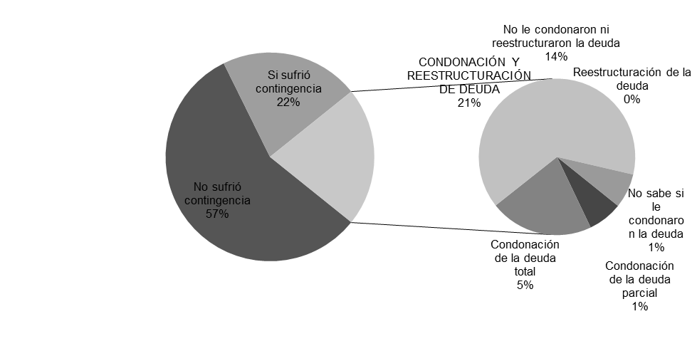 Del 45% de las unidades de producción que han sido financiadas según el Gráfico N° 2, el 57% no sufrió contingencia o eventualidades que les hayan provocado la pérdida de capacidad de pago del financiamiento recibido (Gráfico N° 2). Sin embargo, un 43% fueron víctimas de eventualidades, de los cuales sólo el 5% fueron beneficiados con la condonación o reestructuración de la deuda establecida según la Ley de Atención al Sector Agrícola (Decreto N° 8.684, Gaceta Oficial de la República Bolivariana de Venezuela, 8.684, Mayo 23, 2012), mediante la cual, el gobierno dictó normas para regular la reestructuración y condonación total o parcial de los financiamientos agrícolas concedidos a la producción de rubros estratégicos.