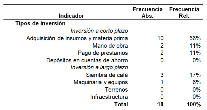 De los productores que han recibido financiamiento, más de dos tercios invirtieron a corto plazo y el resto a largo plazo en siembra de café y adquisición de maquinaria y equipo (Tabla N° 1). El destino de los fondos, en mayor proporción se ha realizado a corto plazo, para el mantenimiento de las plantaciones de café. Dichos recursos a corto plazo están destinados a realizar las operaciones necesarias en el ciclo de producción de la unidad; son recursos que se transforman o consumen durante el proceso de transformación.