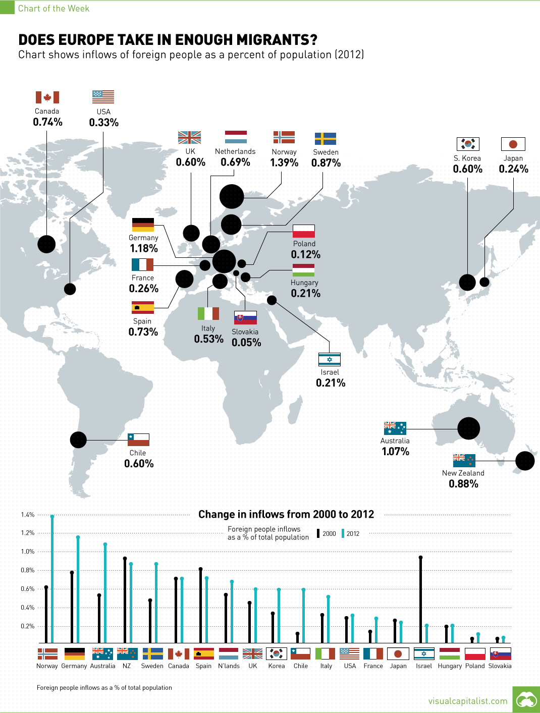 Durante el período que va de 2000 a 2012, Noruega lideró la recepción de migrantes, su tasa pasó del 0,6% al 1,4%; seguida de Alemania de 0,8% a 1,2% y de Australia de 0,5% a 1,1% (Gráfico Nº1).