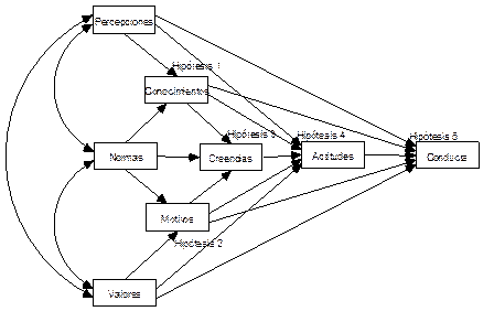 Hipótesis 5b. Normas çè valores (-0,03); valores çè percepciones (0,77); normas çè percepciones (0,23) è conocimientos (0,15) è creencias (0,45) è actitudes (0,13) è conducta (-0,16). De la misma forma que en la hipótesis 4b, los conocimientos explican en gran medida a las creencias, pero éstas reducen ese efecto sobre las actitudes y estas últimas son contraproducentes al auto-cuidado, la visitas al médico o la ingesta de los medicamentos.