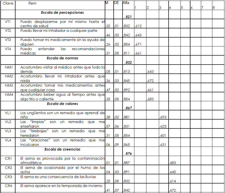 Respecto a la validez, la Tabla Nº 1 muestra los pesos factoriales que evidenciaron ocho factores relativos a percepciones (22% de la varianza total explicada), normas (19% de la varianza total explicada), valores (17% de la varianza total explicada), creencias (15% de la varianza total explicada), conocimientos (11% de la varianza total explicada), motivos (9% de la varianza total explicada), actitudes (5% de la varianza total explicada), conducta (3% de la varianza total explicada).