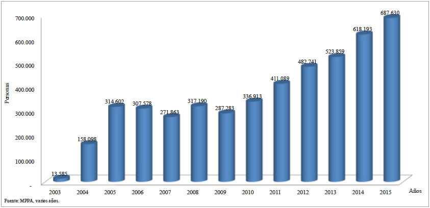 Dichos resultados explican que la región logró tener acceso a 2,70% de la cantidad total de alimentos distribuidos anualmente por la Misión Alimentación en todo el territorio nacional, y con esa cantidad de productos se alcanzó a cubrir 2,75% del total anual de beneficiarios al nivel nacional de dicho programa asistencial (MPPA, 2011). Los años de menor distribución de productos alimenticios entre los habitantes del estado Mérida fueron: 2003-2004, debido a la incipiente cadena de distribución, inicio de la definición institucional de la misión y falta de capacidad instalada; 2007, por el elevado costo de las importaciones, los ajustes de precios de los productos subsidiados y regulados, y la incertidumbre que generó la primera reestructuración de dicha misión al nivel nacional; y 2009, ocasionado por la caída en el flujo de divisas al país, disminución de las importaciones, el cierre de establecimientos Mercal (principalmente Mercalitos Comunitarios), y el necesario ajuste de los precios de las mercancías vendidas a través de esta red del Estado venezolano.