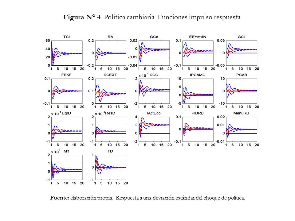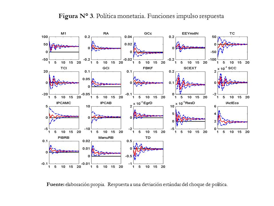 La variabilidad de las variables SCEXT, SCC y EgrD son explicadas en 16,27%, 17,52% y 23% respectivamente, el SCEXT y el EgrD responden positivamente y permanentemente; la varianza de las reservas internacionales son explicadas en 28,32% y responde a largo plazo positivamente como contrapartida de expansión de M1; el consumo (GCi) aumenta permanentemente ante una expansión monetaria; en cuanto a EEYmxtN explica 15,36% de su varianza y su función impulso respuesta no resulta significativa; las variables IActEco, PIBRB y ManuRB responden positiva y permanentemente.