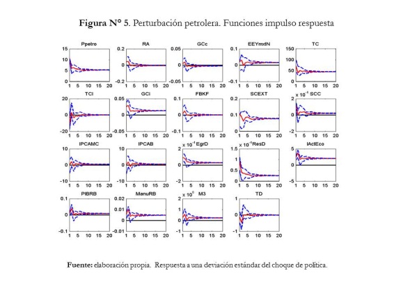 Adicionalmente, muestra evidencia de creación monetaria, corroborando la tesis de que la política monetaria sufre endogenidad de la gestión fiscal; la expansión monetaria afecta precios, variables monetarias y externas; sin embargo, estimula la producción, incluso a largo plazo, resultado anómalo a la teoría que establece la neutralidad del dinero a largo plazo; un aumento del tipo de cambio implícito (choque cambiario) hace que la economía muestre una ganancia de competitividad, que estimula producción, remuneración y el gasto; por último, un aumento del precio del petróleo, es equivalente a un choque positivo de demanda, que mejora las cuentas externas y las reservas monetarias.