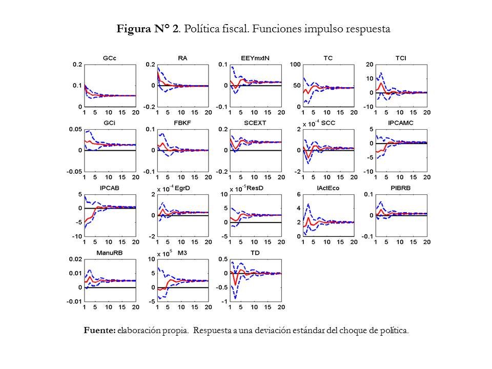 · Un choque de política fiscal, medido como un impulso del GCc genera la respuesta de los precios, la remuneración en los salarios transitoriamente, el excedente de explotación, devaluación del tipo de cambio, las variables de gasto, superávit de cuenta corriente, aumento de la liquidez monetaria y efecto en las variables asociadas a la producción. En síntesis, el choque se comporta como un choque de demanda positivo, que aumenta la producción, y la distribución del ingreso generado; por otro lado, genera aumento del tipo de cambio y creación de dinero endógena.