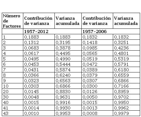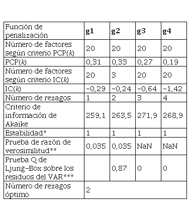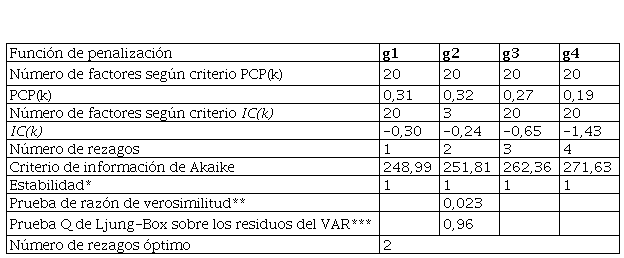 La tabla N° 4 muestra que para explicar más del 50 % de la varianza de los datos es necesaria al menos 5 factores para cada conjunto de datos. El número máximo de factores que permiten estimar un modelo VAR estable es de 8 factores, explicar alrededor del 90 % de la variabilidad de los datos implica usar al menos 20 factores.