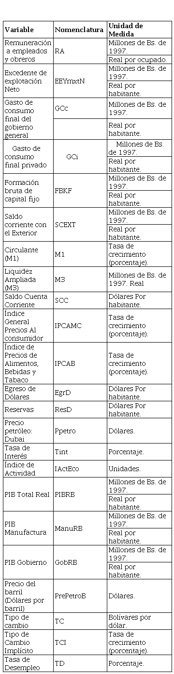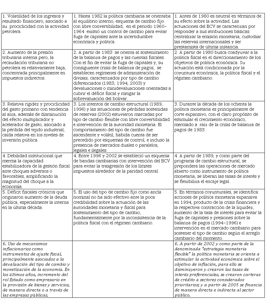 En la tabla Nº 1 se identifican las principales características de la política fiscal basadas en Zambrano (2009), Guerra (2013), Banco Mercantil (2003a, 2003b), Ríos (2003), García, Rodríguez, Marcano, Penfold y Sánchez (1997) y, Clemente y Puente (2001); con base en Guerra y Pineda (2004), Zavarce (2004) y Crazut (2010) se sintetizan las características de la política cambiaria; y, la política monetaria con referencia en autores como Arreaza, Ayala y Fernández (2001), Crazut (2010) y Vera (2009).