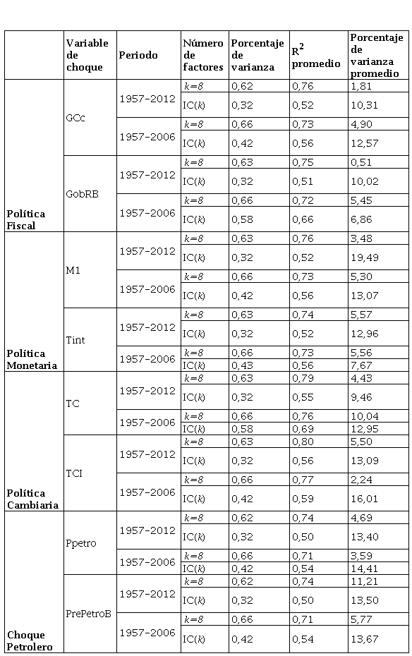 Lo anterior, implica que unos pocos factores logran capturar la dinámica de la actividad productiva. Respecto a la capacidad de cada choque de explicar la variabilidad de la variable por la cual es medido, se tiene que el choque de política fiscal explica el 43,98% de la varianza del GCc, el choque monetario el 85,55% de la variabilidad de M1, la perturbación de política cambiaria el 78,44% del TCI y el choque petrolero explica el 65,23% del Ppetro.