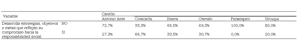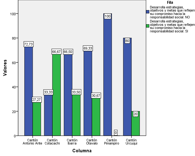 Luego de recoger los datos para el presente estudio empírico, y de comprobar que existe una relación entre las variables a través de la prueba del ji-cuadrado ver (cuadro 7); se procedió a realizar el respectivo análisis de la estadística descriptiva de las variables correlacionadas, determinando que las empresas en Imbabura mayoritariamente no aplican prácticas administrativas con responsabilidad social, estadística que se puede constatar directamente ver (cuadro 4); adicionalmente a esta afirmación se suma la evidencia recogida durante la evaluación de las variables mediante la aplicación del ji-cuadrado ver (cuadro 7), demostrando que el desarrollo estratégico influye en las prácticas de responsabilidad social empresarial en la provincia de Imbabura. Aunque no positivamente, cómo se hubiera esperado, pero él no considerar a la RSE como parte de la filosofía estratégica de una empresa, no permite que se lleve a cabo acciones importantes vinculadas con la responsabilidad social empresarial y sus bondades.