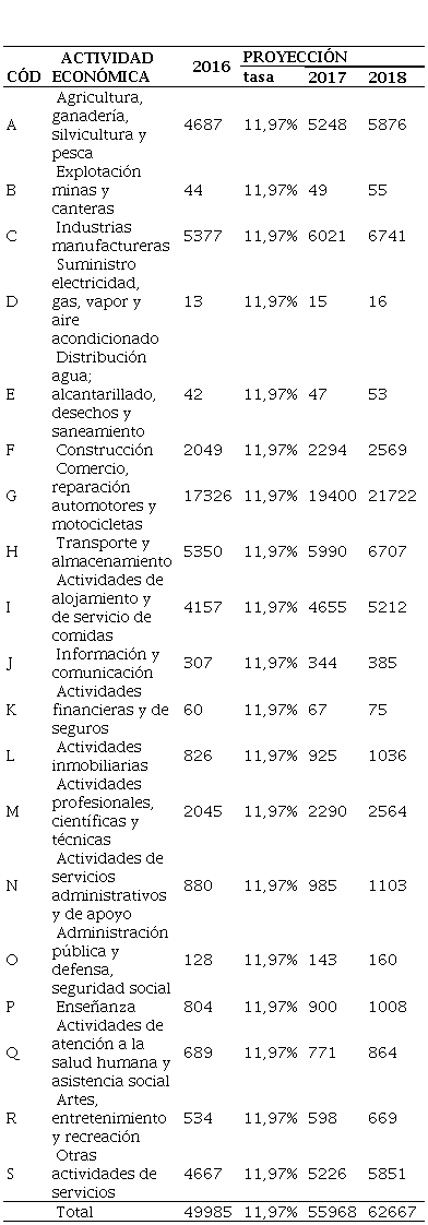 El resultado de 0.1197 es equivalente a 11.97% para el año 2017 y 2018 que se agrega al valor de referencia del año 2016 (49.985 empresas) dando como resultado para el año 2017 una proyección de 55.968 empresas y para el año 2018 aplicando la misma tasa de crecimiento, se proyecta a 62.667 empresas. A continuación esta información se la organizó por sectores económicos para su mejor identificación y aplicación de los instrumentos de medición.