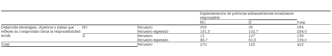 H0: La percepción de prácticas administrativas socialmente responsables son independientes del desarrollo de estrategias, objetivos y metas.