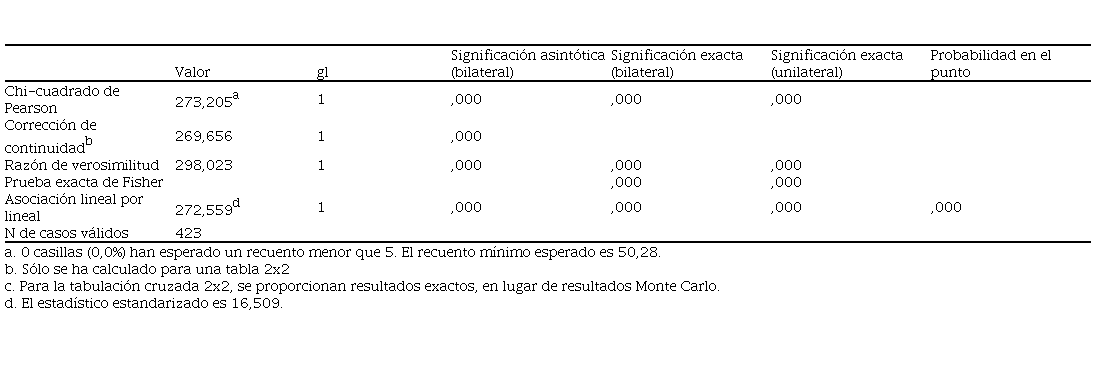 La prueba que se ha utilizado para comprobar la asociatividad entre las variables es la ji-cuadrado, es decir probar si más de dos proporciones de la población pueden ser consideradas iguales .