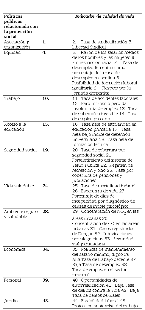 Ahora bien, la calidad de vida en el ámbito del trabajo, el derecho, las políticas públicas, la protección social y de la seguridad social puede expresarse en los siguientes indicadores: