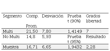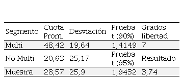 La evaluación contiene dos pruebas t por diferencia de medias. La primera prueba sirve para comprobar que la estrategia multi-marcas, se practica efectivamente en contextos donde la cantidad de compañías competidoras en promedio es mayor (21,50) que en casos donde es menor (14,8). En este sentido, el resultado de la prueba t de una cola y con 7 grados de libertad, son significativos al 90 y 95 por ciento, ya que el coeficiente es mayor al valor de la prueba en un 90 y 95 por ciento (Cuadro 10), lo que permite corroborar el planteamiento hipotético.