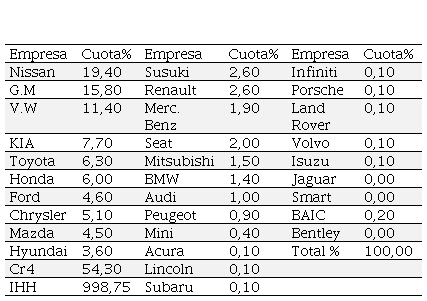 Hi: La industria automotriz es una estructura oligopólica, segmentada donde las cuotas de mercado por segmento son mayores a la concentración de mercado generalizada y diferenciada donde las marcas son un indicador de competitividad.