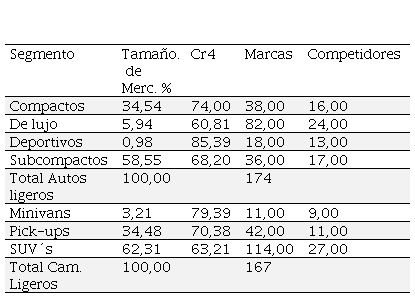 La información del cuadro 2 indica que los autos compactos y subcompactos poseen la mayor cantidad de ventas totales por volumen en la categoría de autos ligeros (93 por ciento), donde poseen índices de concentración (Cr4) moderadamente altos puesto que las ventas que corresponden a las cuatro compañías líderes en sus respectivos segmentos son mayores al 68 por ciento de las ventas totales por volumen (74 y 68,20 por ciento respectivamente), donde se ubican 38 y 36 marcas compitiendo en los segmentos mencionados, así como 16 y 13 armadoras automotrices compitiendo, es decir en promedio, se visualizan 2,37 marcas por compañía automotriz en el segmento de compactos y 2,11 marcas en subcompactos, lo que indica un elevado nivel de diferenciación por segmentos y una estructura oligopólica (Cuadro Nº 2).