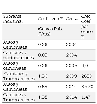 El cuadro Nº 3 indica que la publicidad como herramienta competitiva es un patrón de competencia dinámico en el sector porque de cada 100 pesos vendidos, se destinan 55 centavos a la dicha partida en la sub-rama de autos y camionetas en 2014, año para que se tiene el último estadístico. Asimismo, para la subrama de camiones y tractocamiones, se destina a la publicidad 1.38 pesos por cada 100 vendidos, donde los coeficientes han crecido por periodo censal (cuatro años) en 89,7 por ciento para la subrama de autos camionetas de 2009 a 2014, y de 1,47 por ciento de 2009 a 2014 para camiones y tractocamiones, visualizando que la publicidad es un medio para diferenciar productos.