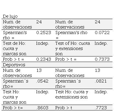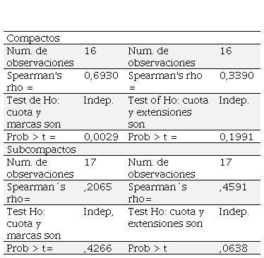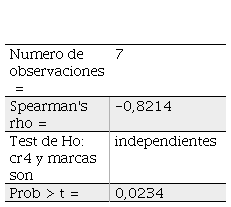 Los resultados indican un coeficiente de correlación de Spearman (rho) de -.8214, significativo al 95 por ciento de confianza. La correlación indica que cuando aumenta el índice de concentración, la cantidad de marcas disminuye (Cuadro 4) para los siete segmentos que clasifica el Instituto Nacional de Geografía y Estadística (INEGI).