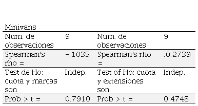 Finalmente, se analiza la asociación entre la estrategia multi-marcas, extensiones de línea y la cuota de mercado en un segmento pequeño respecto a las ventas totales de la categoría de camiones ligeros, que es el caso de las minivans. El cuadro Nº 8 indica que las dos estrategias mencionadas no tienen asociación alguna con la variación en la cuota de mercado, puesto que no son significativas.