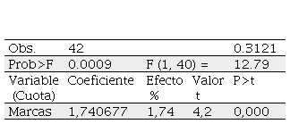 Posteriormente, los segmentos que poseen correlación entre diferenciación de producto y cuota de mercado son discriminados por una elevada cantidad de competidores y representatividad en las ventas. De esta manera se obtiene una muestra para analizar con la técnica de regresión y establecer un análisis de sensibilidad, entre la variable cantidad de marcas (numérica) y la cuota de mercado (numérica), las cuales fueron transformadas a logaritmos con la finalidad de establecer un efecto marginal entre la independiente (cantidad de marcas) y la dependiente (cuota de mercado). Por tanto, la regresión es una función log-log.