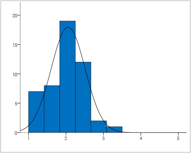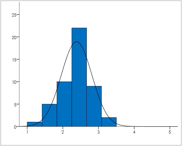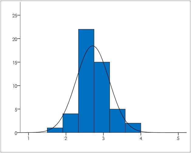 Los datos proporcionados por el personal docente de la UNICA (tabla 10 / gráfico 3), en sesenta y nueve (69) afirmaciones vinculadas con los componentes del capital estructural, se presentaron de forma homogénea distribuidos entre un valor mínimo de 1,40 y un máximo de 3,41 con poca dispersión reflejada en la desviación estándar de 0,43 alrededor de la media 2,39. La distribución de datos es normal según el coeficiente de asimetría -0,06 y el coeficiente de curtosis -0,05. La percepción de los profesores se mantuvo en valores bajos de la escala de actitudes, en consecuencia, estos consideran que el capital estructural no es adecuado para sostener el capital intelectual de la organización.