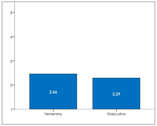 La valoración de los profesores para el capital estructural de la organización (gráfico 4), según su sexo, se posicionó en el nivel de medias bajas en la escala de actitudes, con una escasa diferencia de 0,17 entre la media general alcanzada por el sexo femenino (2,46) y el sexo masculino (2,29). Se puede inferir que el personal docente percibe que el capital estructural de la UNICA, en el año 2019, no es adecuado para la generación de conocimiento desde sus activos intangibles.