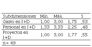En el capital tecnológico, la dimensión esfuerzos en I+D (tabla 7) se manifestó entre medias bajas y muy bajas de la escala de valoración, la media más elevada se registró en la subdimensión personal I+D (2,25), seguido por las subdimensiones proyectos I+D (1,77) y gasto en I+D (1,75). El personal docente percibe que el esfuerzo en materia de investigación y desarrollo no es adecuado para la generación de conocimiento.