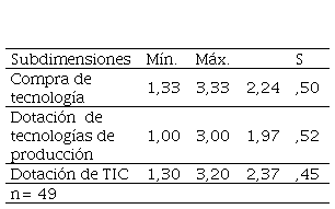 La dimensión dotación tecnológica (tabla 8) se ubicó en medias bajas para las subdimensiones dotación TIC (2,37) y compra de tecnología (2,24), y en una media muy baja para la subdimensión dotación de tecnologías de producción (1,97). Los profesores consideran que la dotación señalada no es adecuada para sostener el capital tecnológico.
