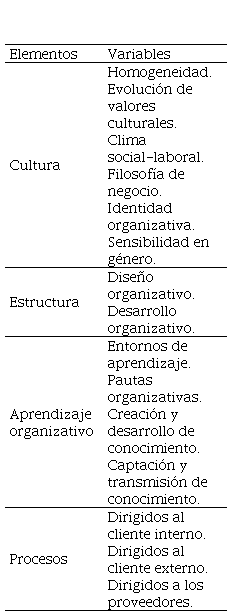 El capital organizativo se conforma por elementos intangibles de diversa naturaleza que constituyen y promueven oportunamente la identidad y la actividad de la organización (CIC, 2011). Este capital se compone de cuatro elementos básicos, actualizados desde su establecimiento en el Modelo Intellectus: cultura, constituida principalmente por normas, valores y creencias compartidas y asimiladas por la mayoría de los integrantes de la organización y que construyen su identidad; estructura, relacionada con los estilos y procesos de organización formal del sistema; aprendizaje organizativo, representado por la capacidad la organización para adquirir conocimientos de diversa naturaleza que permitan responder a las dinámicas de cambio; y procesos, establecidos por el conjunto de actividades que configuran las operaciones de la organización dirigidas a sus clientes y proveedores. La medición de los elementos del capital organizativo se realiza por medio de grupos definidos de variables (cuadro Nº 1).