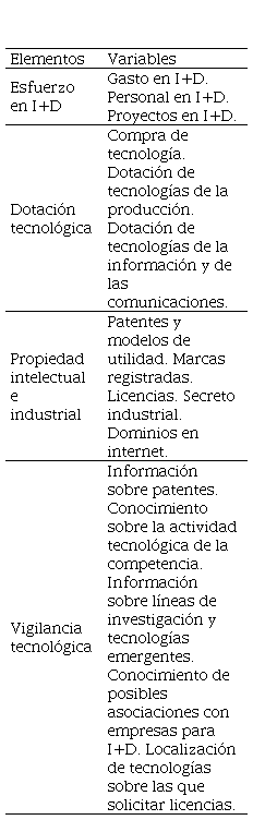 El capital tecnológico refiere a los activos intangibles relacionados con el desarrollo de actividades y funciones del sistema técnico de la organización de las cuales depende la obtención de bienes y servicios, los procesos de producción y el desarrollo de conocimiento e innovación (CIC, 2011). Este capital se constituye de cuatro elementos, actualizados desde su creación: esfuerzo en I+D, orientado a la promoción de conocimiento derivado del método científico y su incorporación para concebir nuevos usos; dotación tecnológica, determinada por la incorporación de conocimiento no incluido en el “esfuerzo en I+D” que persigue la eficiencia y eficacia de los procesos en la organización; propiedad intelectual e industrial, vinculada al volumen de conocimiento creado por la organización y protegido legalmente para su explotación; y vigilancia tecnológica, establecida en un sistema de gestión organizado y permanente para captar información tecnológica del exterior de la organización que será transformada en conocimiento. Los elementos del capital tecnológico se miden de acuerdo a un conjunto de variables (cuadro Nº 2).