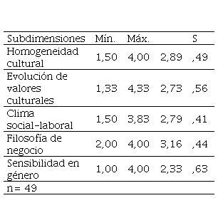 Para el capital organizativo en su dimensión cultura (tabla Nº 2) la media más elevada se registró en un valor intermedio de la escala con la subdimensión filosofía de negocio (3,16), seguido por otras medias que se posicionaron en valores bajos para las subdimensiones homogeneidad cultural (2,89), clima social-laboral (2,79), evolución de valores culturales (2,73) y sensibilidad de género (2,33). El personal docente percibe que los aspectos relacionados con la cultura organizativa no son adecuados para sostener el capital estructural de organización.