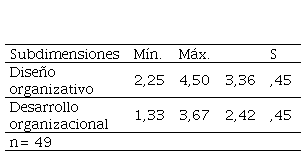 En la dimensión estructura (tabla 3) la medía más alta se ubicó en la subdimensión diseño organizativo (3,36) con un valor intermedio de la escala y la media más baja en la subdimensión desarrollo organizacional (2,42) con un valor bajo. Los profesores consideran una estructura organizativa edificada, pero que demanda ajustes cónsonos con la realidad de la organización.