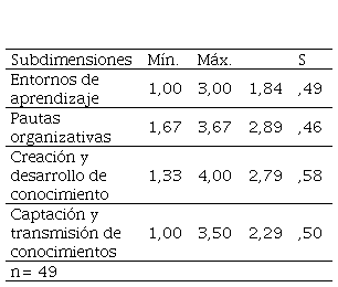 La dimensión aprendizaje organizativo (tabla Nª 4) se mantuvo entre medias bajas y muy bajas de la escala de la valoración, con el valor más alto registrado en la subdimensión pautas organizativas (2,89) y el más bajo en la subdimensión entornos de aprendizaje (1,84), entre ambas subdimensiones se posicionaron creación y desarrollo de conocimiento (2,79) así como captación y transmisión de conocimientos (2,29). Los profesores perciben que el aprendizaje organizativo no es adecuado para generar conocimiento desde los activos intangibles que se inscriben en el capital organizativo.