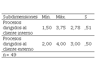 La dimensión procesos del capital organizativo (tabla 5) se presentó con una valoración intermedia para la subdimensión procesos dirigidos al cliente externo (3,00) y una media baja para procesos dirigidos al cliente interno (2,78). La percepción del personal docente casi alcanzó, en líneas generales, un punto intermedio en la escala de valoración, esto podría indicar que aun cuando existen procesos organizativos definidos hacia los clientes deben adecuarse al escenario actual de la organización.