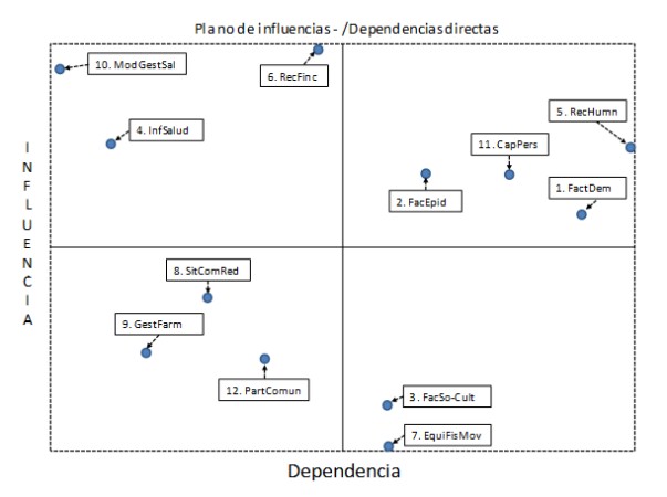 Para la realización de la siguiente matriz se realizó una visión consensuada de los participantes, esto se hizo a través de la interrogación del panel; para cada interrogante se asignó un valor (1=bajo, 2=medio y 3=alto). Con los resultados obtenidos se elaboró la matriz de influencia-dependencia y se construyó el plano de coordenadas que permitió interpretar la ubicación de las variables en los cuadrantes respectivos.