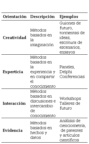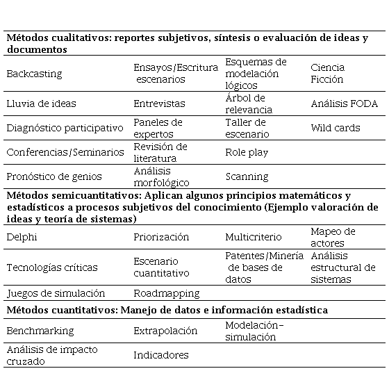 A continuación se muestran los diferentes métodos usados en la prospectiva para luego describir la metodología utilizada en esta la presente investigación. En los métodos presentados en los cuadros N° 1 y N° 2 que se muestran a continuación, se pueden observar las impresiones relacionadas con las opiniones articuladas de expertos acerca del futuro. Estos enfoques pueden llevarse a la práctica, a través de encuestas de opinión a gran escala o por medio de la elaboración de visiones técnicas más limitadas y detalladas, como por ejemplo el análisis de impacto cruzado y los talleres de análisis de escenarios, de acuerdo con Red FOREN (2002), según adaptación de Medina y Ortegón (2006).